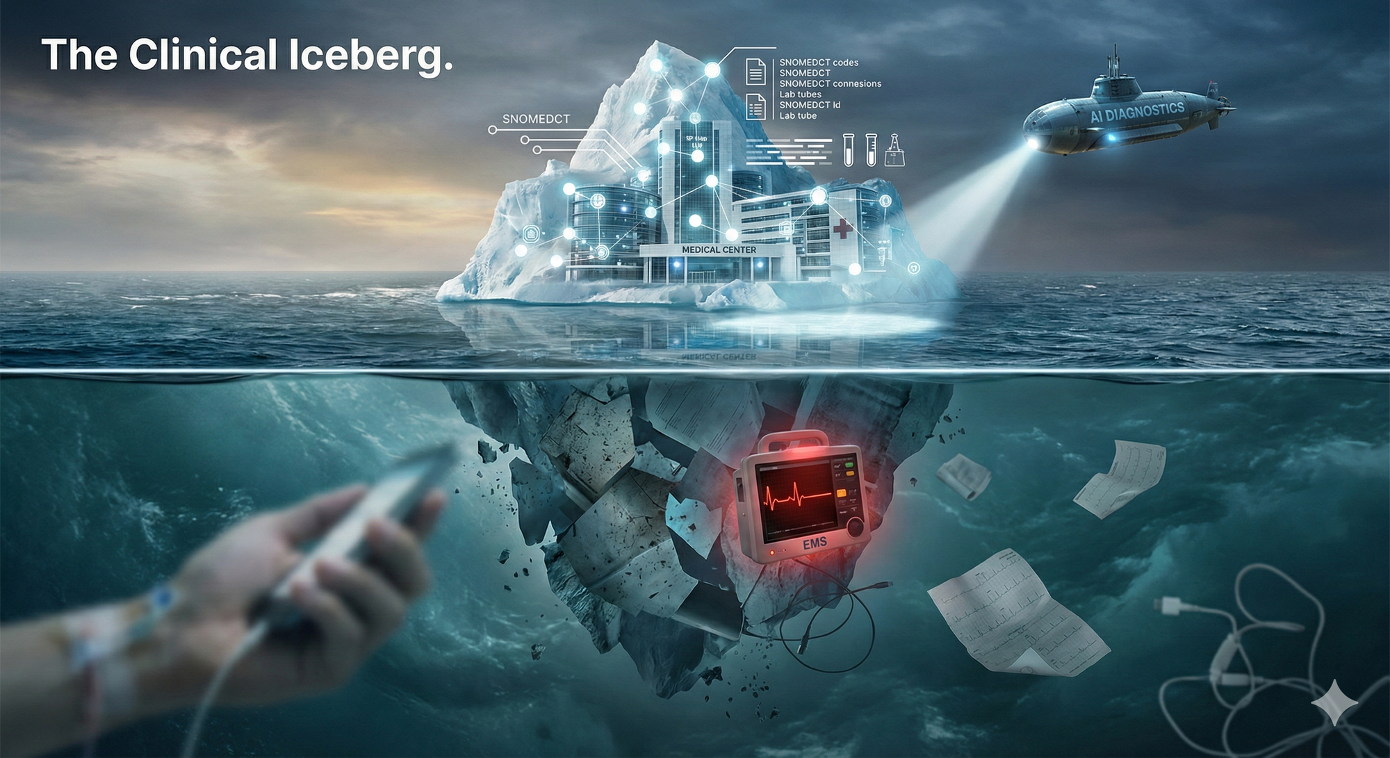 Think of it as a clinical iceberg. Above the waterline sits everything the healthcare system chose to document: the hospital admission, the structured note, the lab result, the discharge summary. That is what AI sees. That is what it learned from. Below the waterline sits everything that happened before the patient arrived: the phone call, the field assessment, the paper chart, the verbal handoff, the three lines of notes from a CPR run. The iceberg is not small. For the sickest patients, most of the clinical story is underwater. And the AI submarine scanning the surface has no idea what it is not seeing.